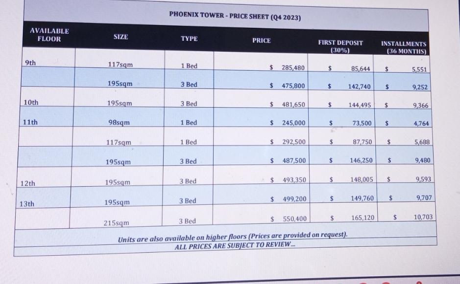 - Instalment prices: 30% initial deposit, 36 months instalment payments. ( price sheet attached)